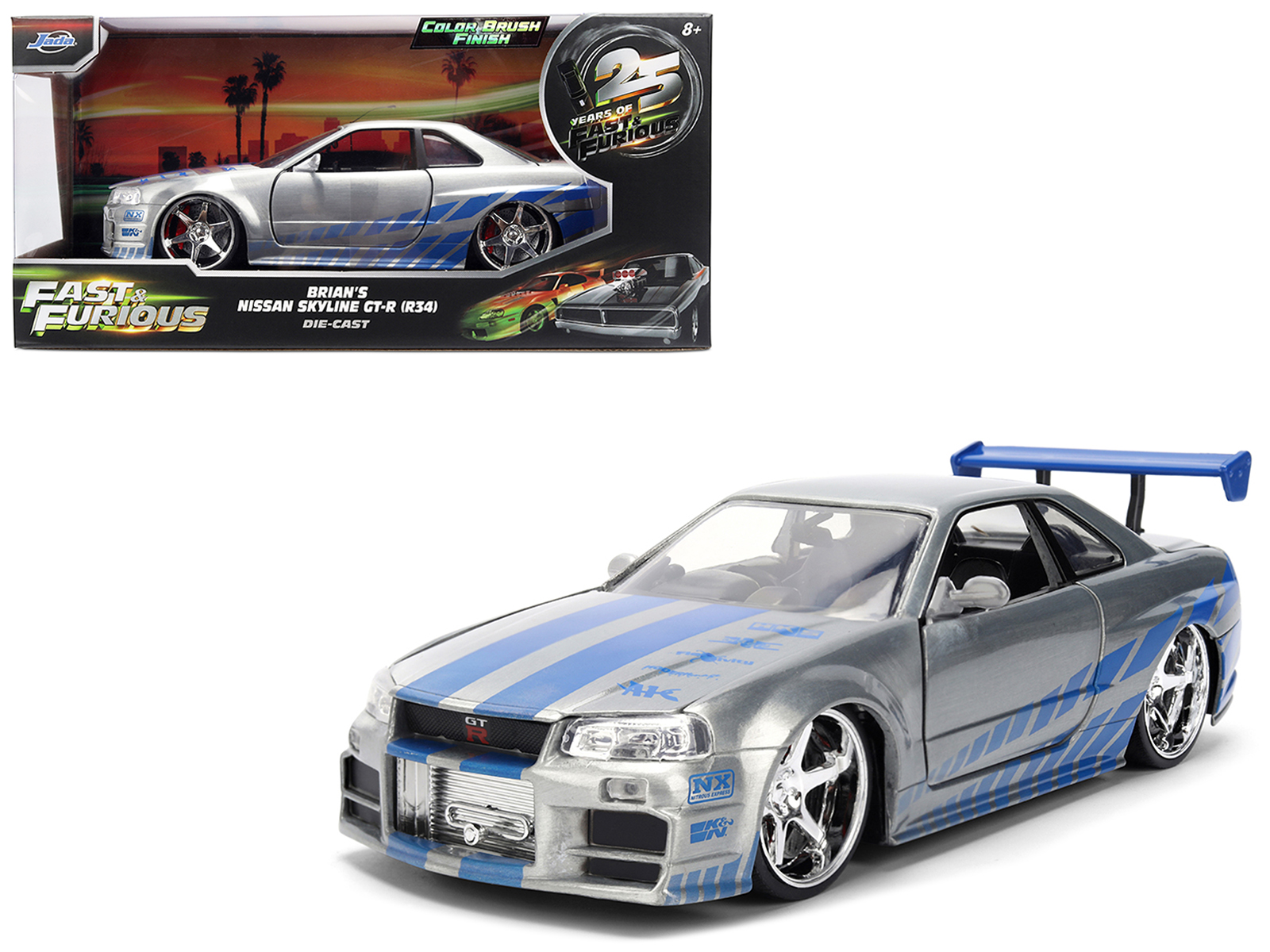 - Brand new 1/24 scale diecast car model of Brian’s Nissan Skyline GT-R (R34) RHD (Right Hand Drive) Silver Color Brush Finish with Blue Stripes “2 Fast 2 Furious” (2003) Movie “Fast & Furious” 25 Years Fast & Furious Anniversary die cast model car by Jada.