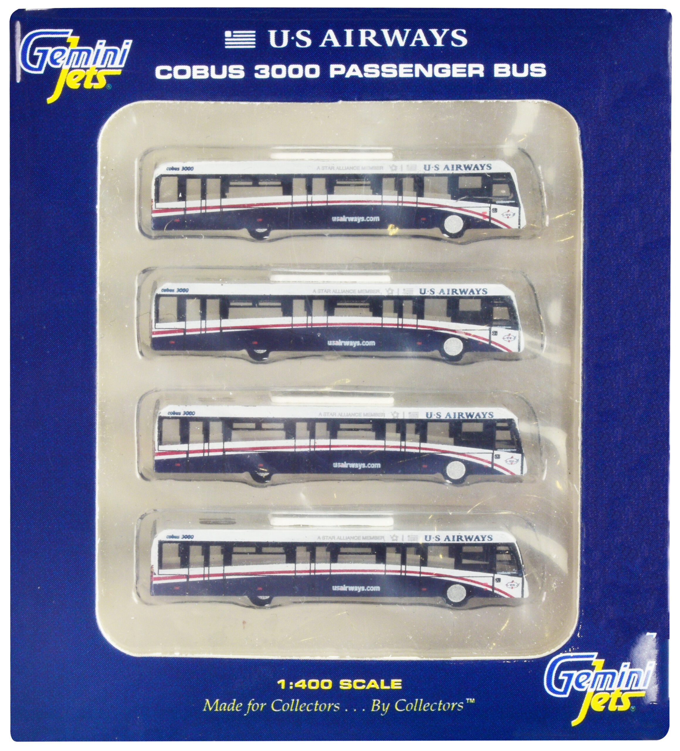 - Brand new 1/400 scale diecast models of Cobus 3000 Passenger Bus White and Blue “US Airways Shuttle Bus” 4 Piece Set die cast models by GeminiJets.