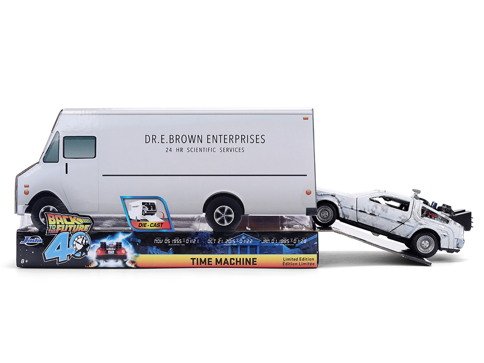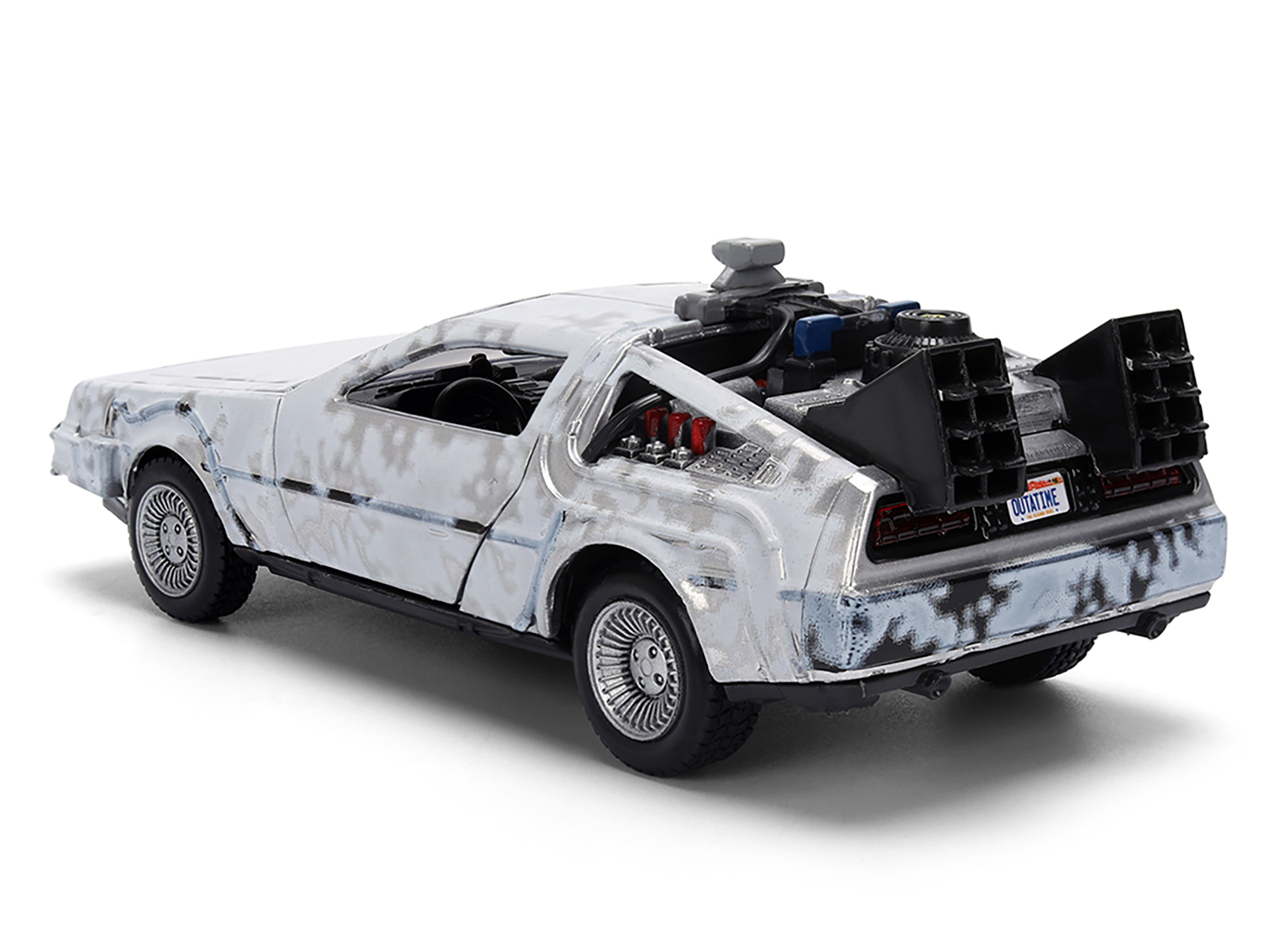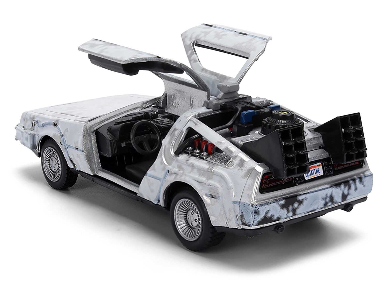 - Brand new 1/32 scale diecast car model of DMC DeLorean Time Machine Brushed Metal (Frost Version) “Back to the Future” (1985) Movie “40th Anniversary” Special Packaging “Hollywood Rides” Series die cast model car by Jada.