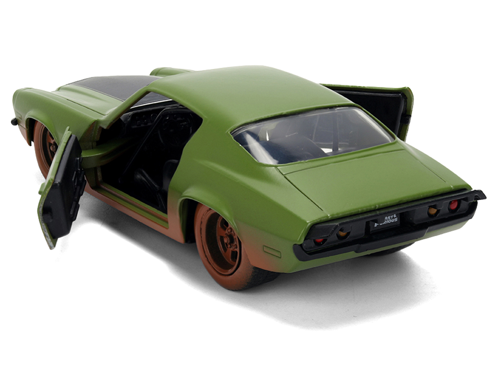 - Brand new 1/32 scale diecast car model of Dom’s 1973 Chevrolet Camaro “F-Bomb” Matt Green (Dirty Version) with Black Hood Stripe “Fast & Furious” (2009) Movie “Fast & Furious 25 Years” Series die cast model car by Jada.