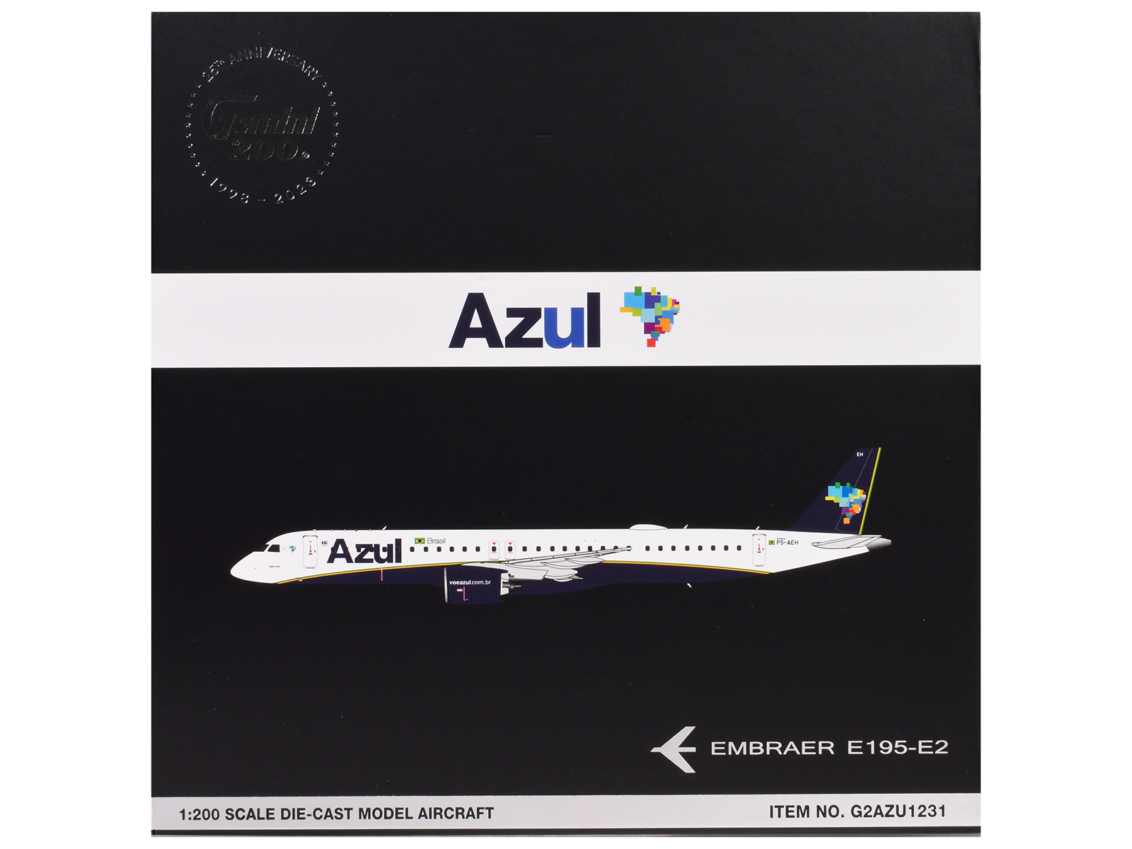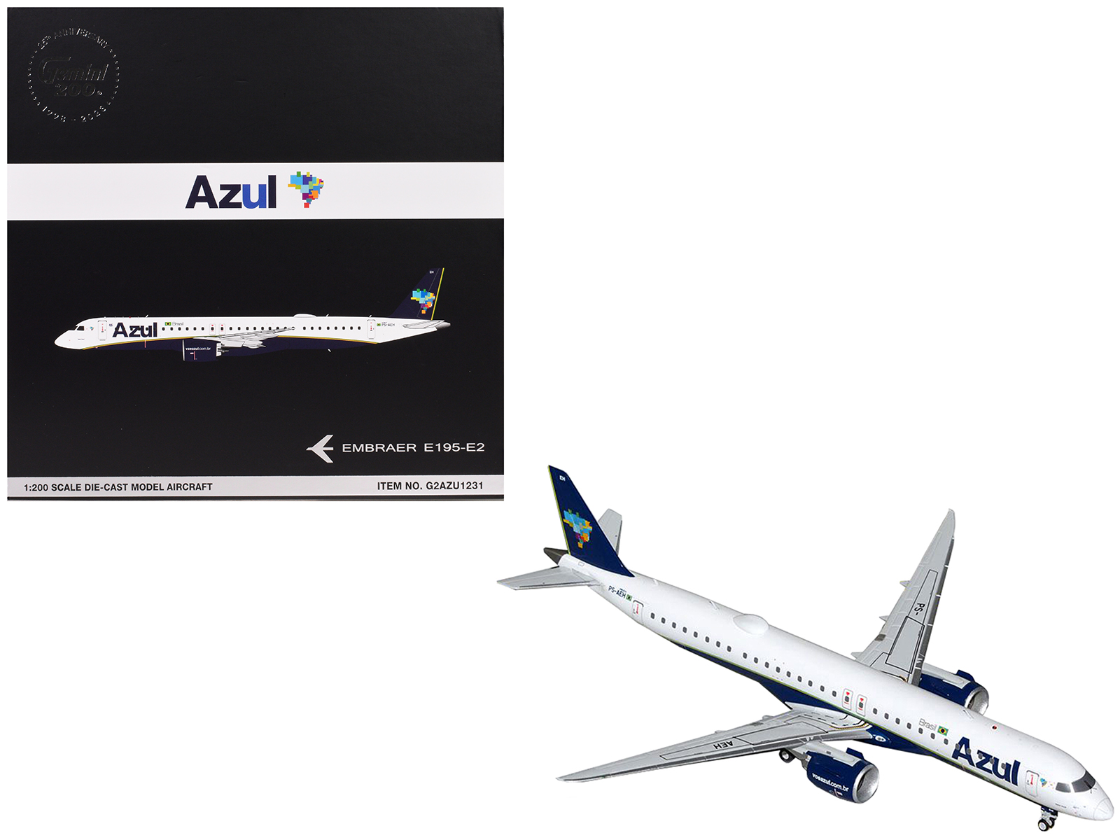 - Brand new 1/200 scale diecast airplane model of Embraer E195-E2 Commercial Aircraft “Azul Brazilian Airlines” (PS-AEH) White with Blue Tail “Gemini 200” Series die cast model by GeminiJets.