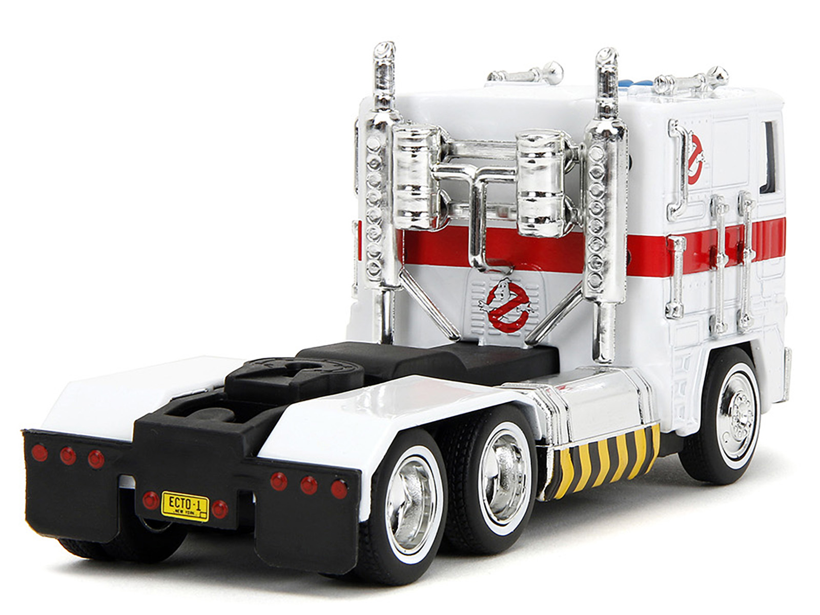 - Brand new diecast model of G1 Autobot Optimus Prime Truck White with Robot on Chassis from “Transformers” TV Series – “Ghostbusters” (1984) Movie Crossover “Hollywood Rides” Series die cast model by Jada.