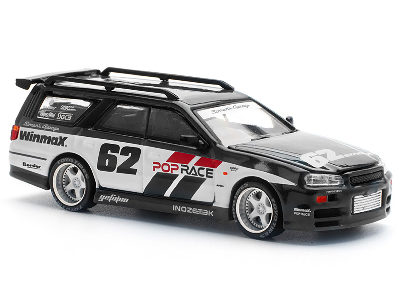 - Brand new 1/64 scale diecast car model of GT-R Stagea RHD (Right Hand Drive) #62 “Simon’s Garage” Black with White Sides die cast model car by Pop Race.