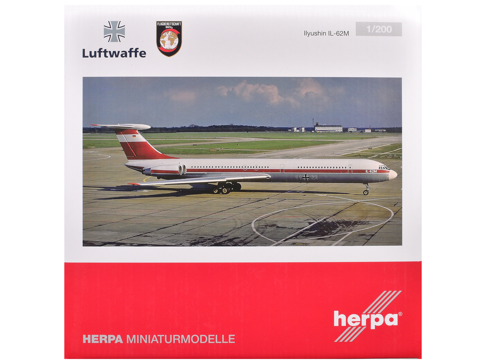 - Brand new 1/200 scale diecast airplane model of Ilyushin IL-62M Commercial Aircraft “German Luftwaffe” (11+22) White with Red Stripes die cast model by Herpa.
