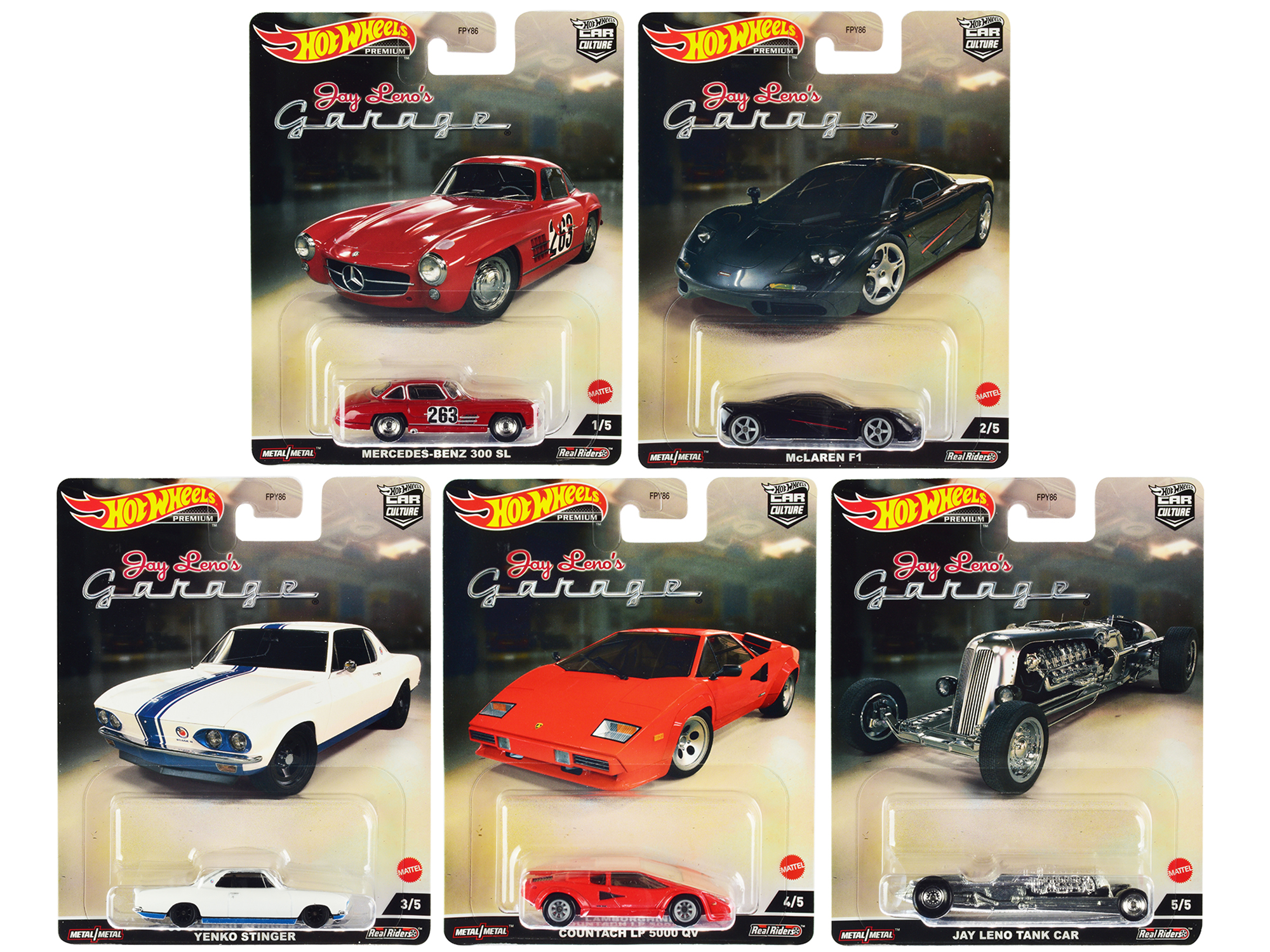 - Brand new diecast car models of “Jay Leno’s Garage” 5 piece Set “Car Culture” Series die cast model cars by Hot Wheels.