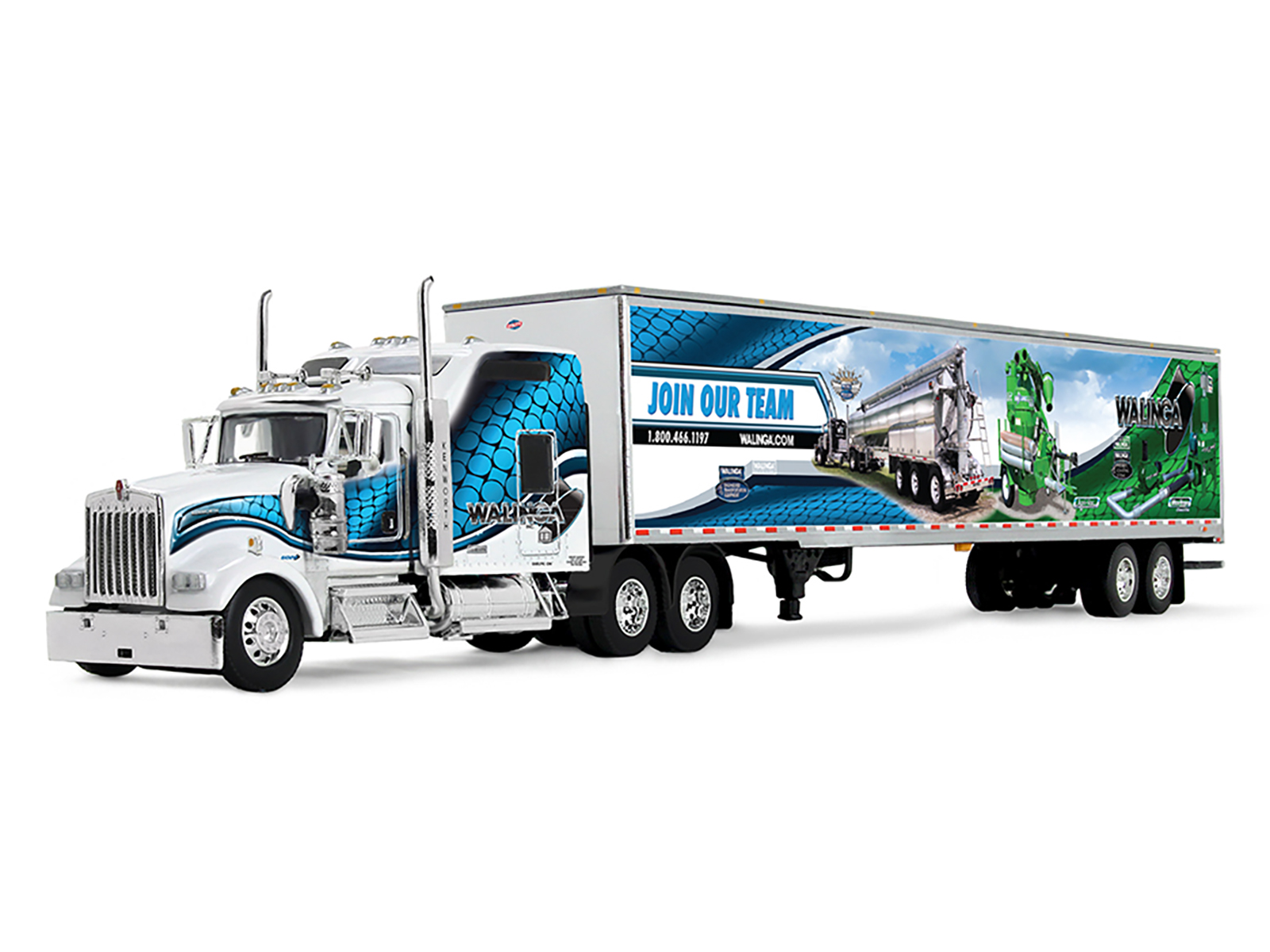 - Brand new 1/64 scale diecast model of Kenworth W900L with 86″ Studio Sleeper and 53′ Utility Trailer with Skirts “Walinga” White with Blue Graphics die cast model by DCP/First Gear.