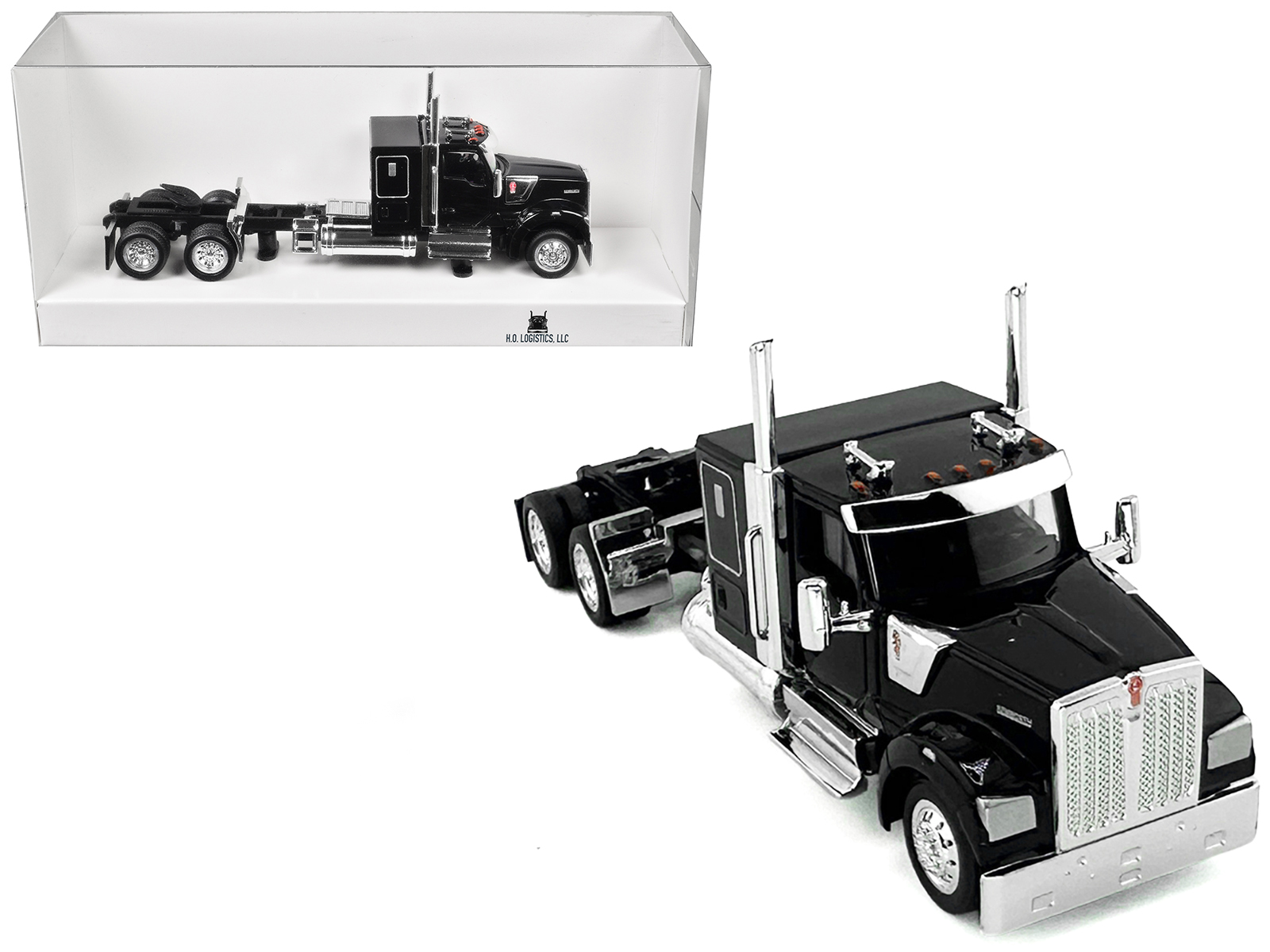 - Brand new 1/87 (HO) scale plastic car model of Kenworth W990 with Flat Top Sleeper Cab Black plastic model car by HO Logistics.