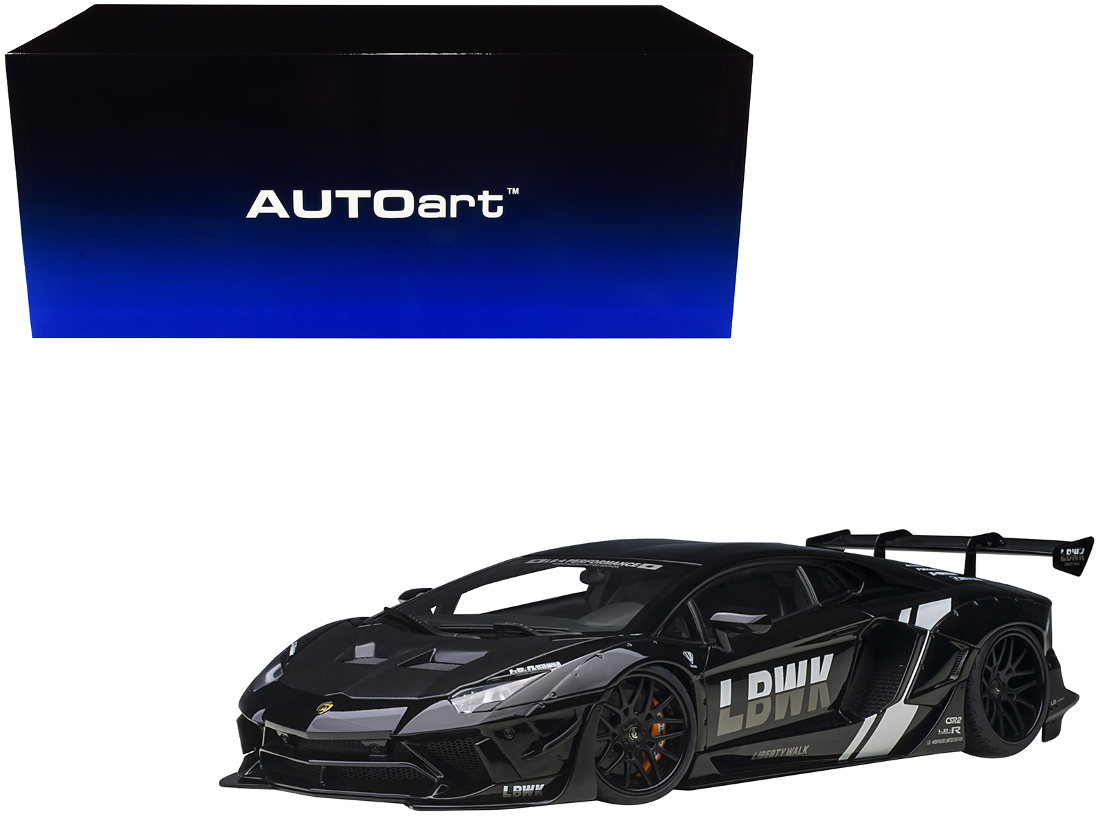 - Brand new 1/18 scale model car of Lamborghini Aventador Liberty Walk LB-Works Livery Black with Carbon Hood Limited Edition model car by Autoart.