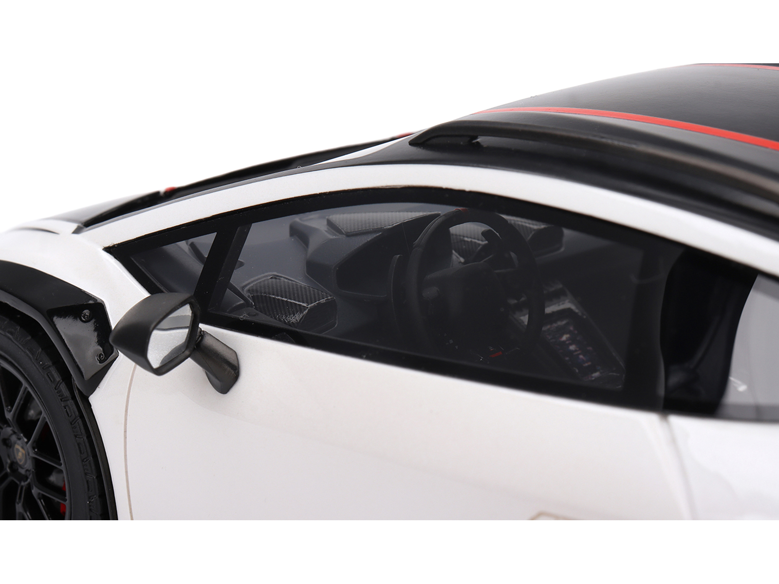 - Brand new 1/18 scale car model of Lamborghini Huracan Sterrato Bianco Asopo White with Matt Black Top and Red Stripes model car by Top Speed.