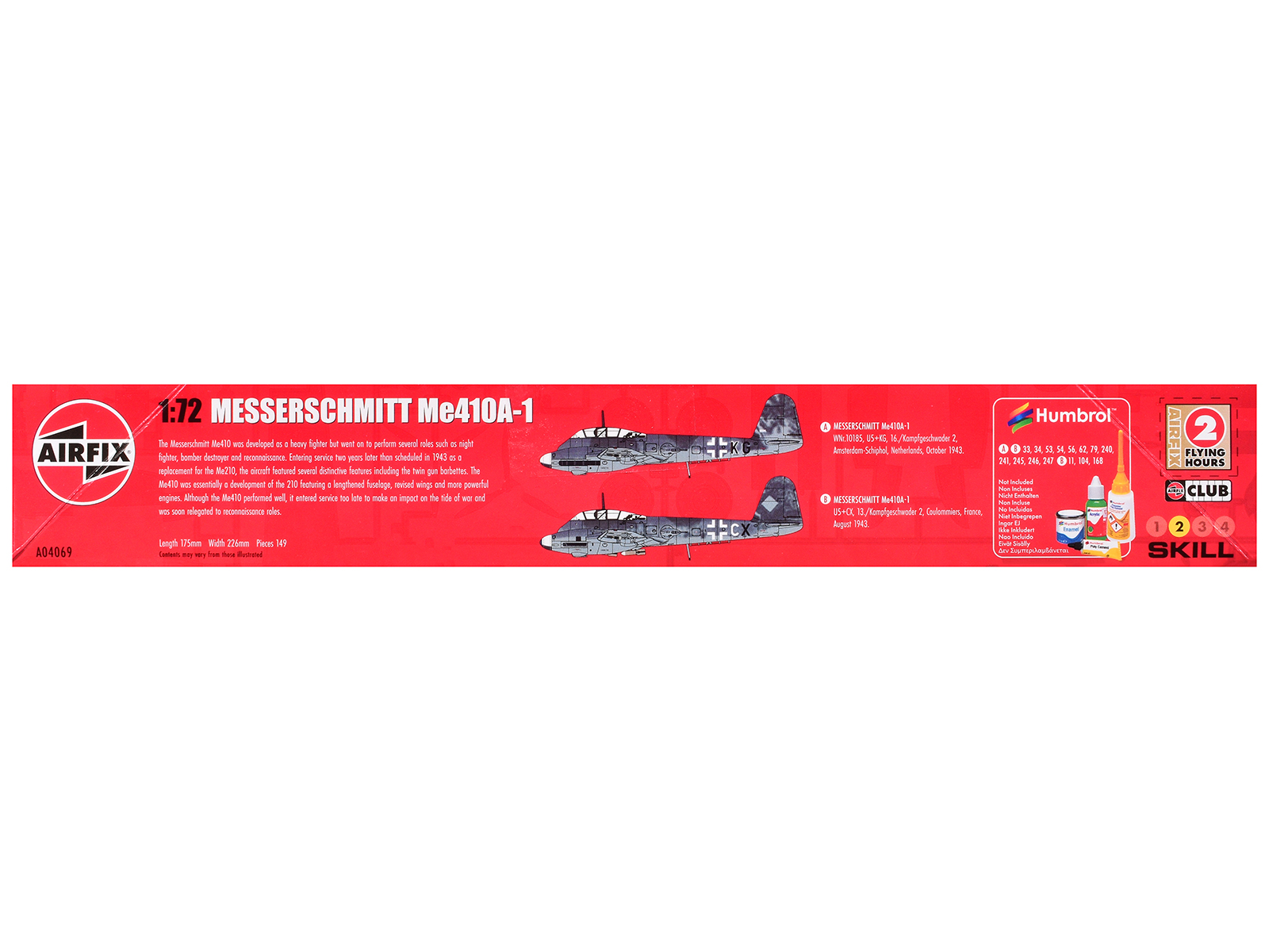 - Brand new plastic model kit of Messerschmitt Me410A-1 Fighter Aircraft with 2 Scheme Options (Level 2) 1/72 plastic model kit by Airfix.