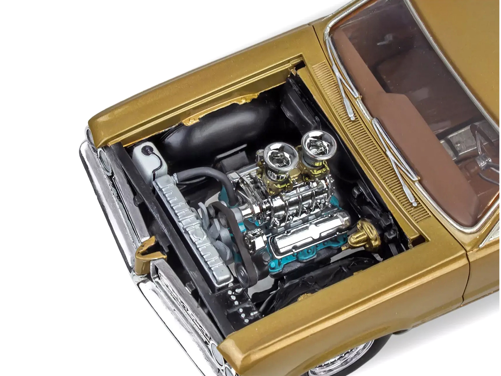 - Carefully detailed 389-cube V-8 with Tri-Power carbs or an optional blower with dual four-barrels.