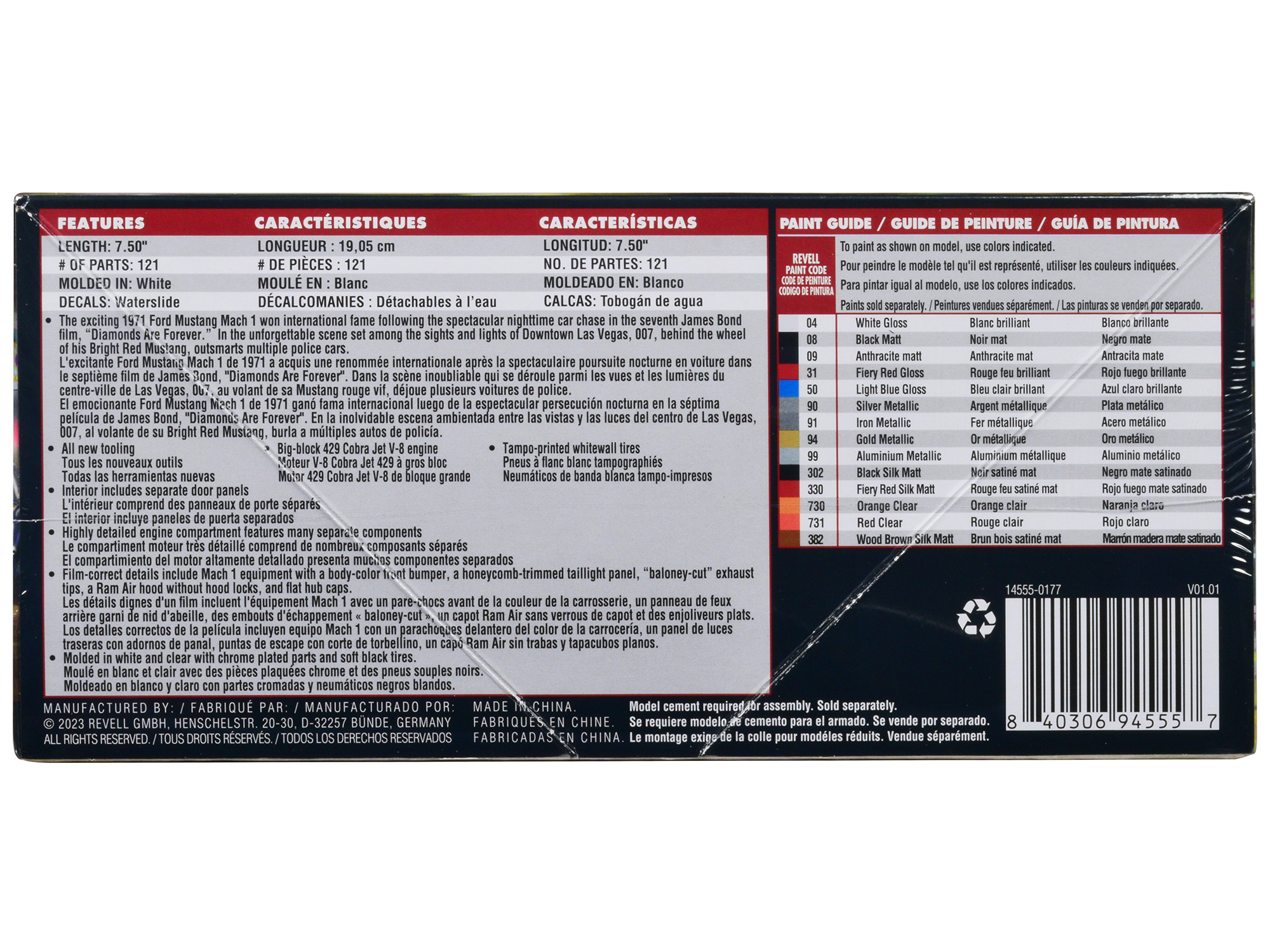 - Brand new plastic model kit of 1971 Ford Mustang Mach 1 James Bond 007 “Diamonds Are Forever” (1971) Movie (Level 4) 1/25 plastic model kit by Revell.