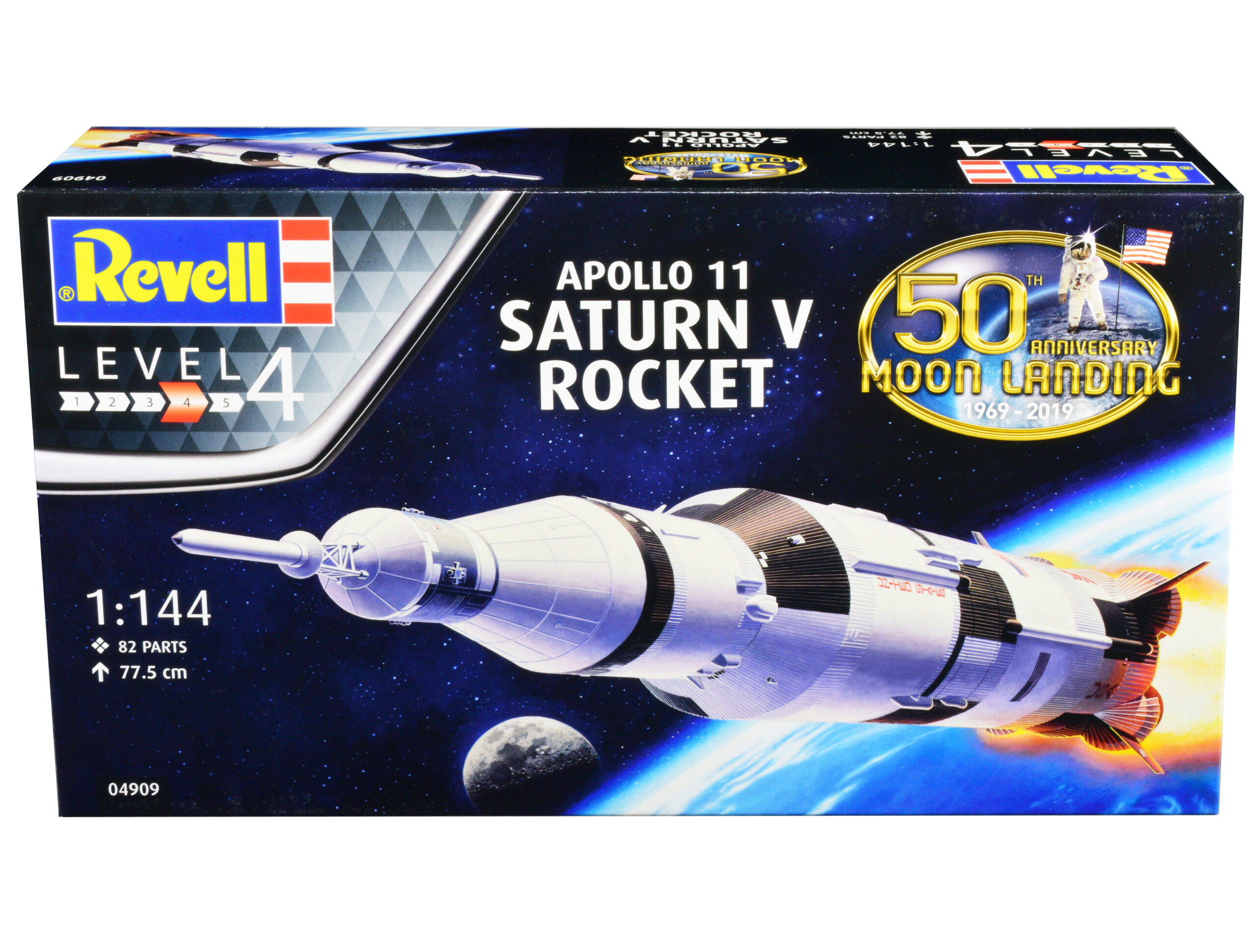 - Brand new plastic model kit of Apollo 11 Saturn V Rocket “50th Anniversary Moon Landing” (Level 4) 1/144 plastic model kit by Revell.