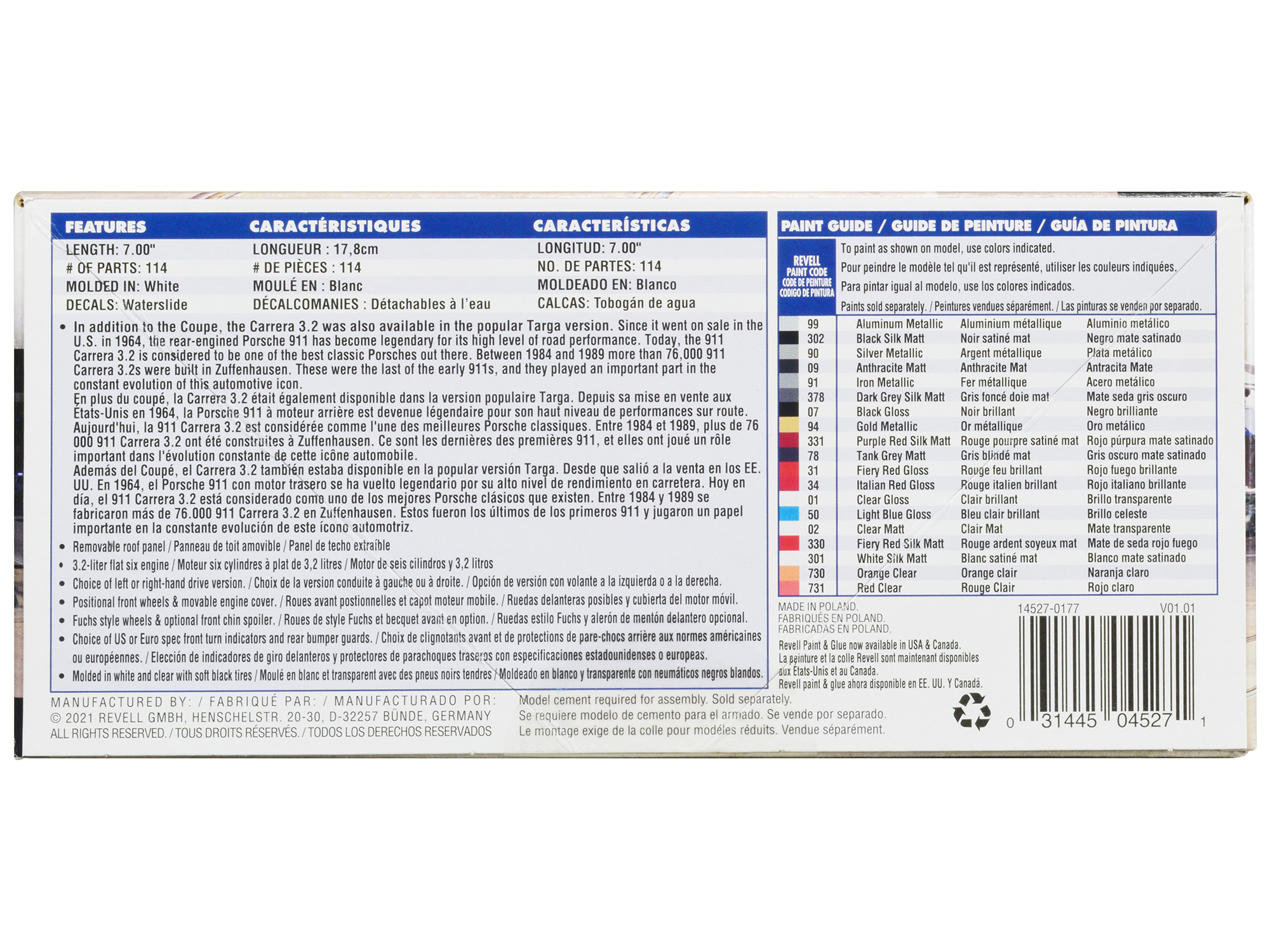 - Brand new plastic model kit of Porsche 911 Carrera 3.2 Targa 2-in-1 Kit (Level 4) 1/24 plastic model kit by Revell.