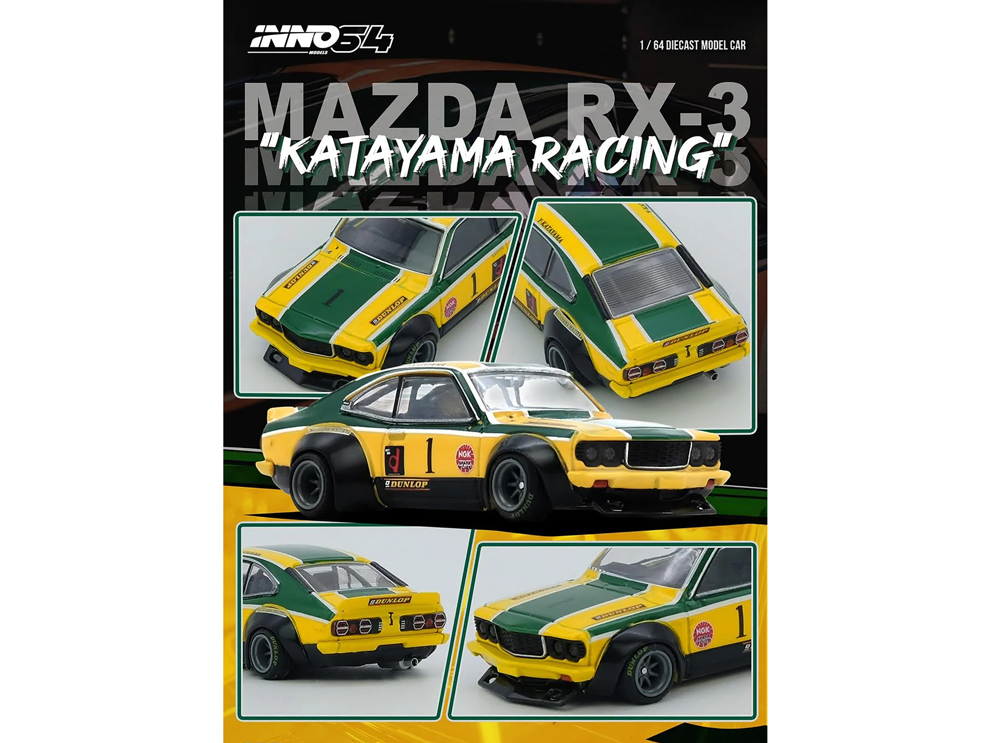 - Brand new 1/64 scale diecast car model of Mazda RX-3 Savanna RHD (Right Hand Drive) #1 “Katayama Racing Livery” Green and Yellow Striped die cast model car by Inno Models.