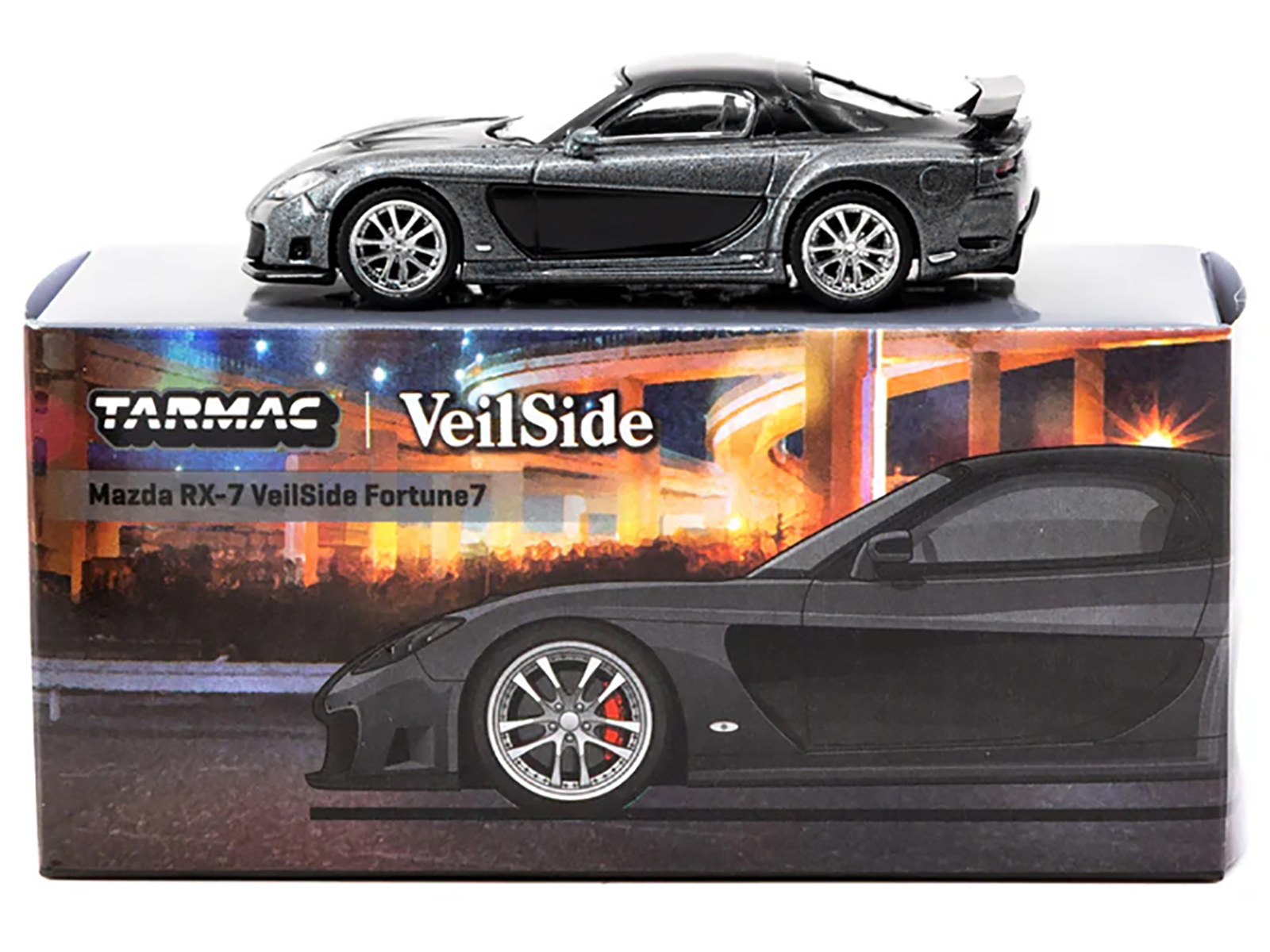 - Brand new 1/64 scale diecast model car of Mazda RX-7 “VeilSide Fortune7” RHD (Right Hand Drive) Gray Metallic and Black “Global64” Series die cast model car by Tarmac Works.
