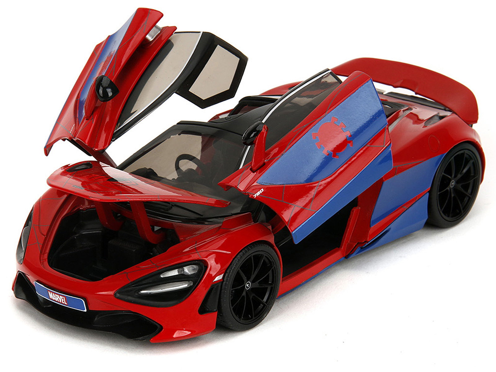 - Brand new 1/24 scale diecast car model of McLaren 720S Red and Blue with Black Top and Graphics and Spider-Man Diecast Figure “Marvel Spider-Man” “Hollywood Rides” Series die cast model car by Jada.