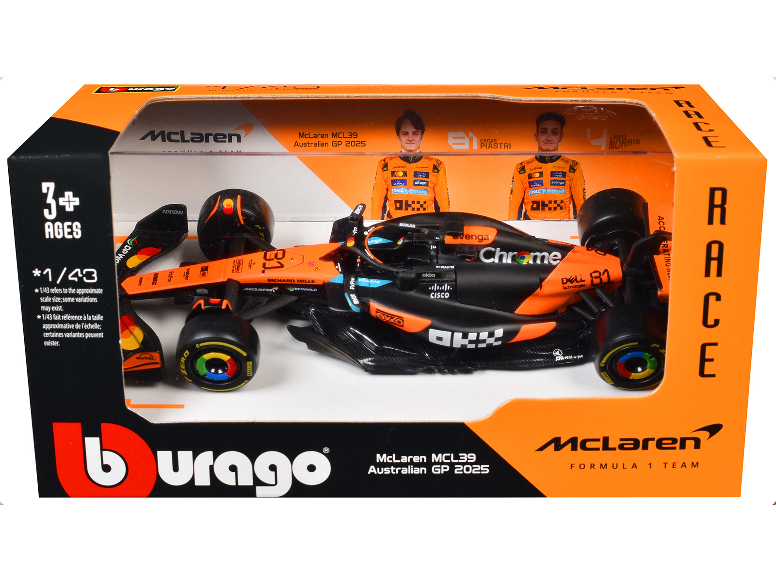 - Brand new 1/43 scale diecast car model of McLaren MCL39 #81 Oscar Piastri “OKX” Formula One F1 “Australian GP” (2025) “Race” Series die cast model car by Bburago.
