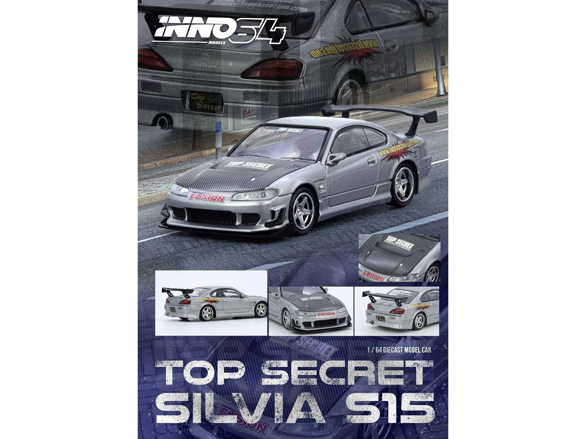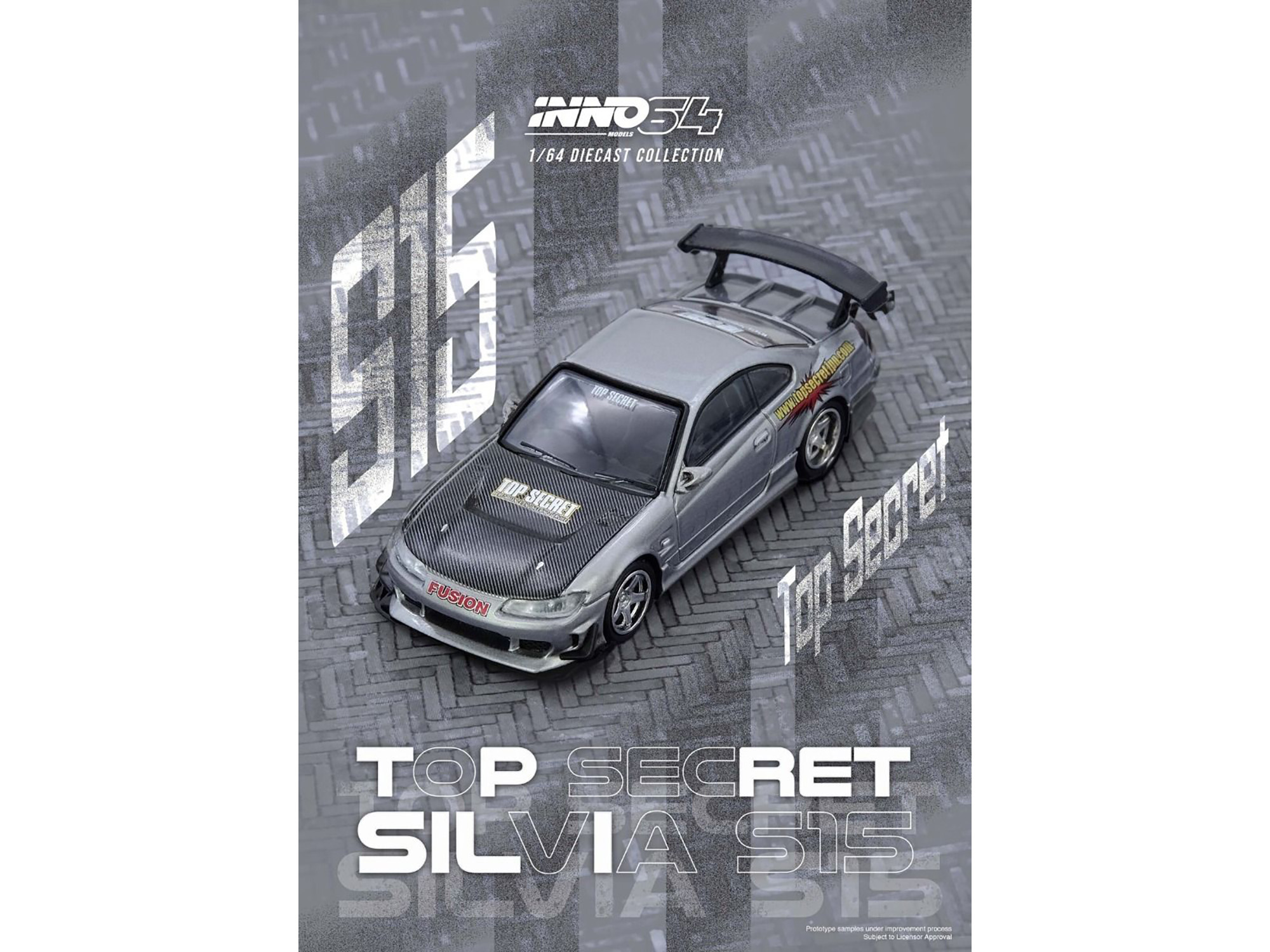 - Brand new 1/64 scale diecast car model of Nissan “Top Secret” Silvia (S15) RHD (Right Hand Drive) Silver Metallic with Carbon Hood die cast model car by Inno Models.