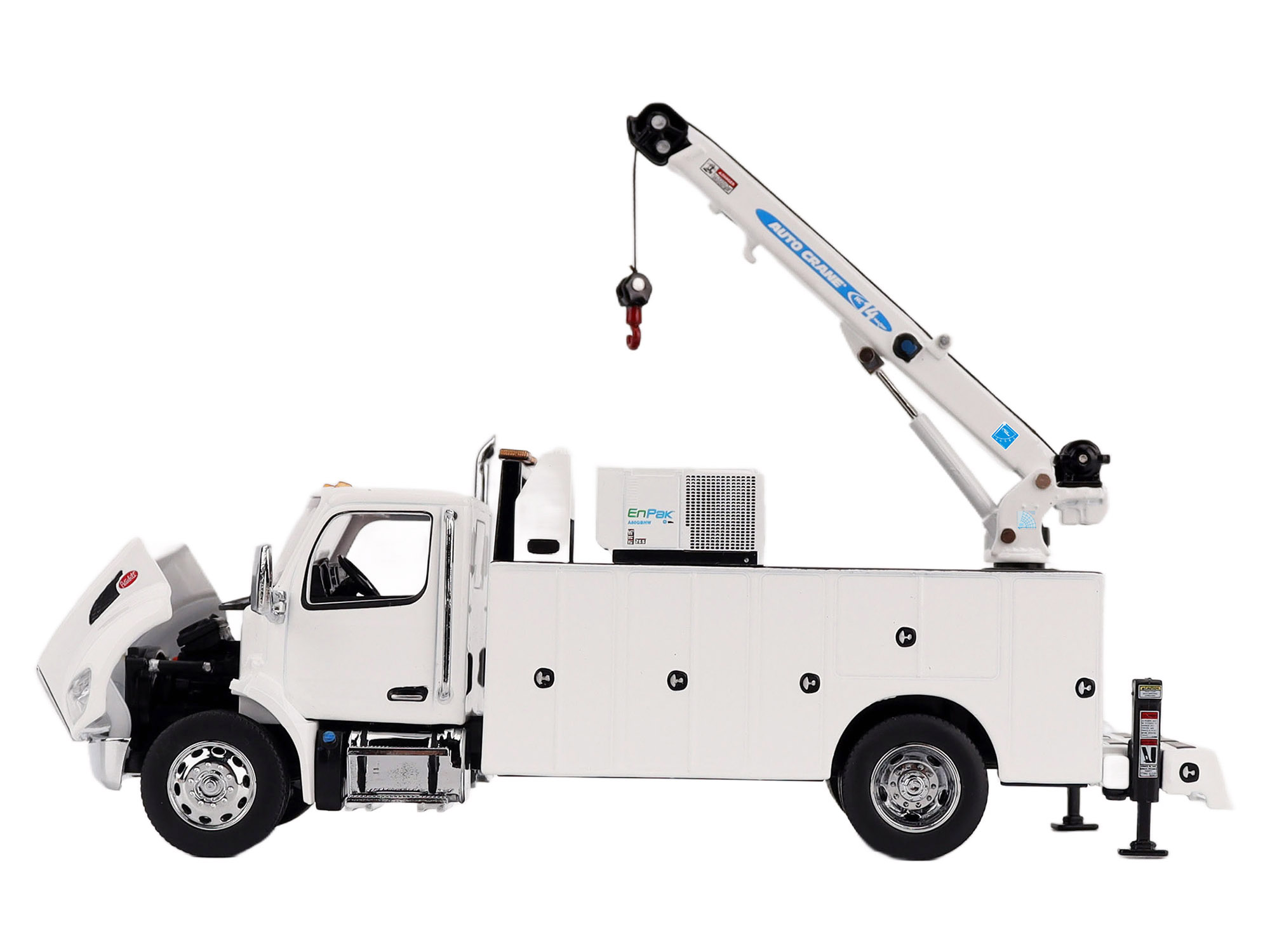 - Brand new 1/50 scale diecast model of Peterbilt 536 Auto-Crane Titan85-Body HC14-Crane Work Truck with Miller EnPak White “Transport Series” die cast model by Diecast Masters.