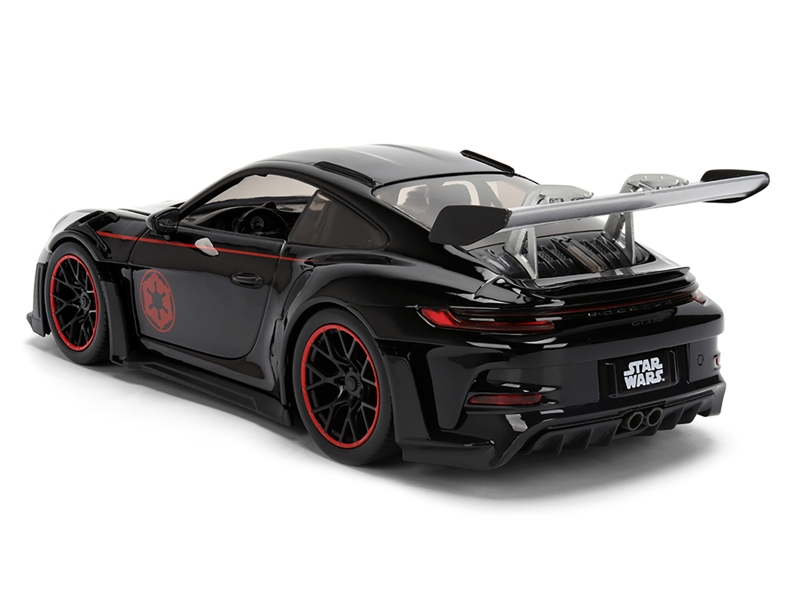 - Brand new 1/24 scale diecast car model of Porsche 911 GT3 RS (992) Black with Silver Hood and Graphics and Darth Vader Figure “Star Wars” Franchise “Hollywood Rides” Series die cast model car by Jada.