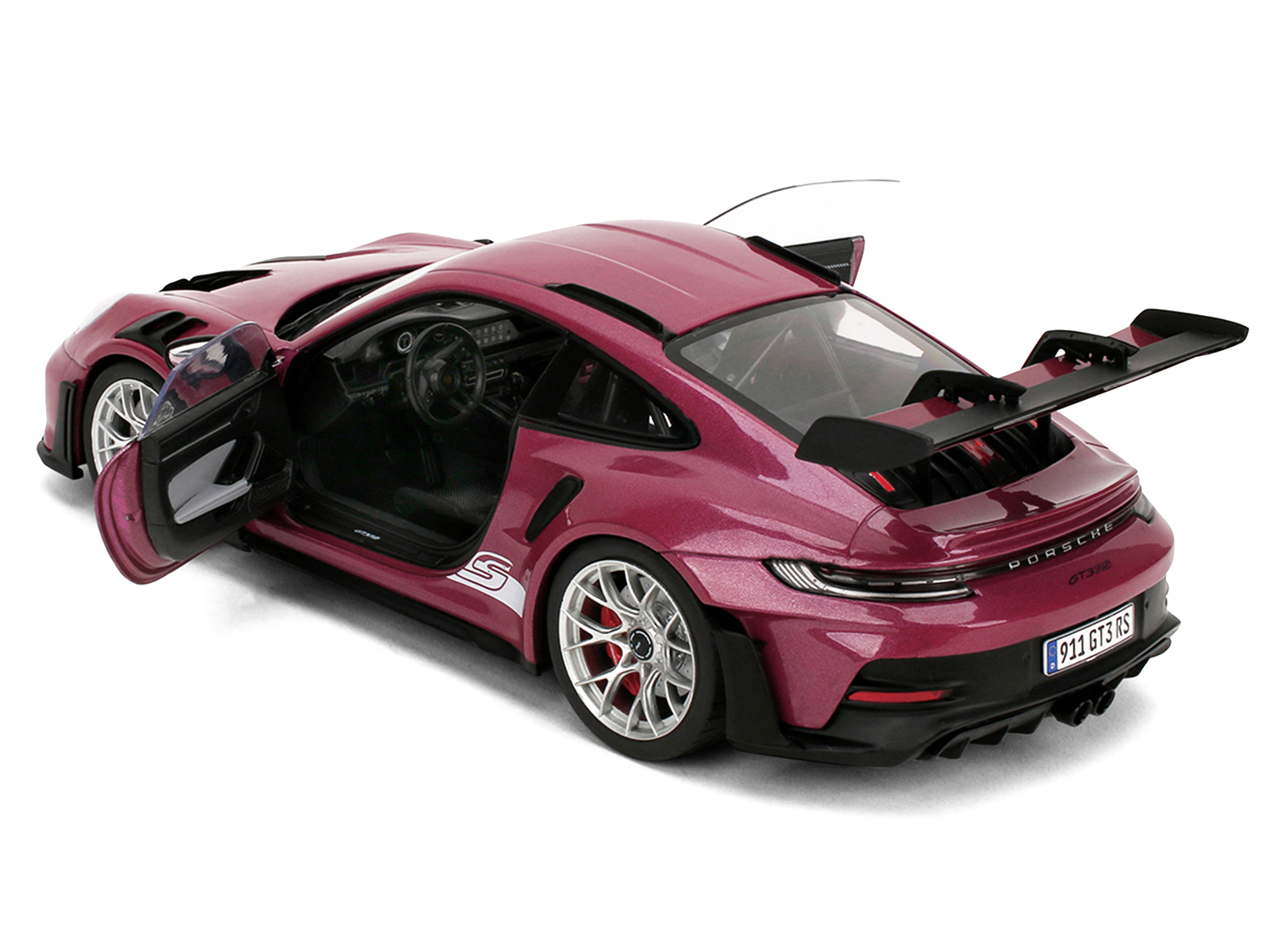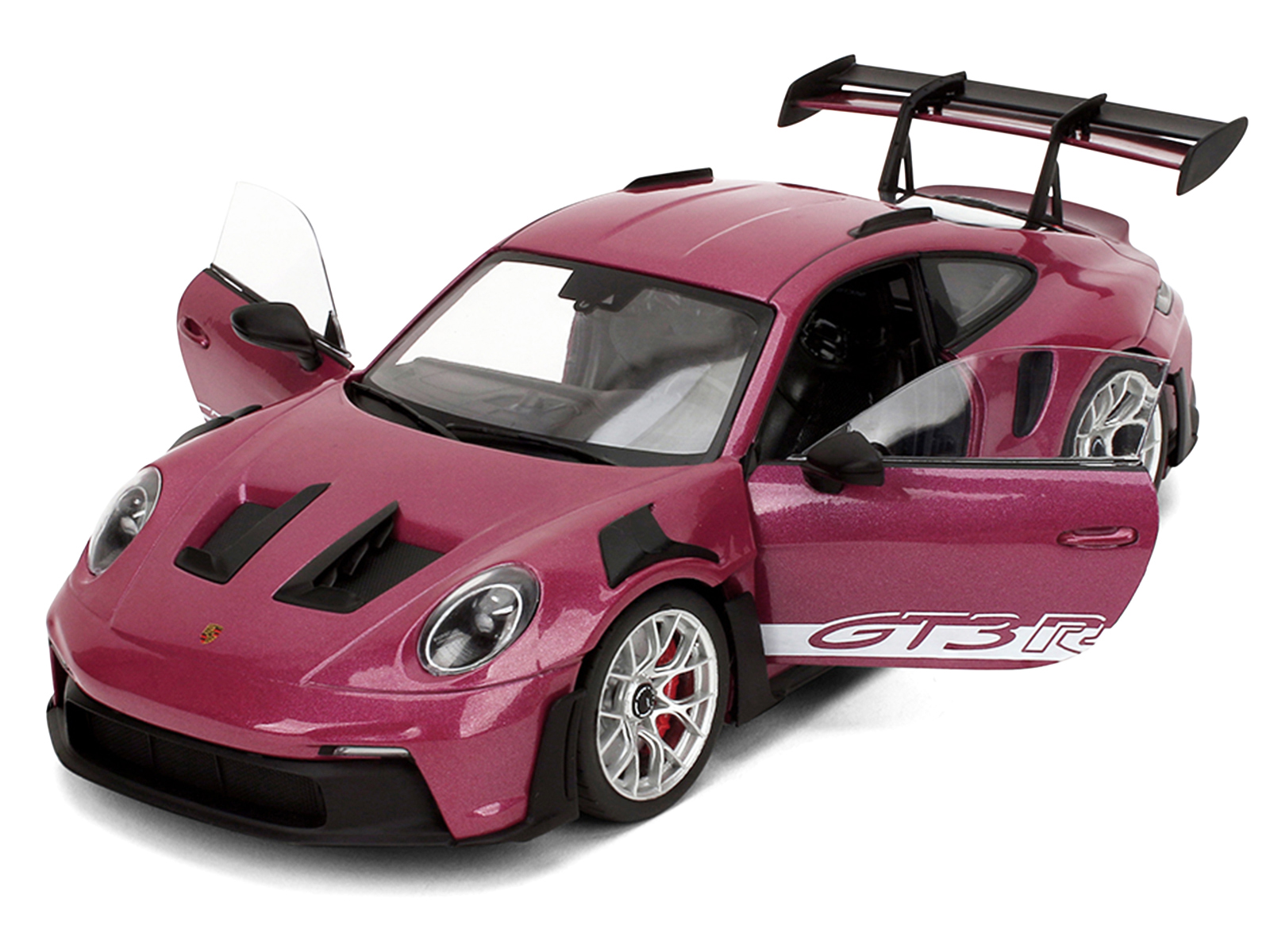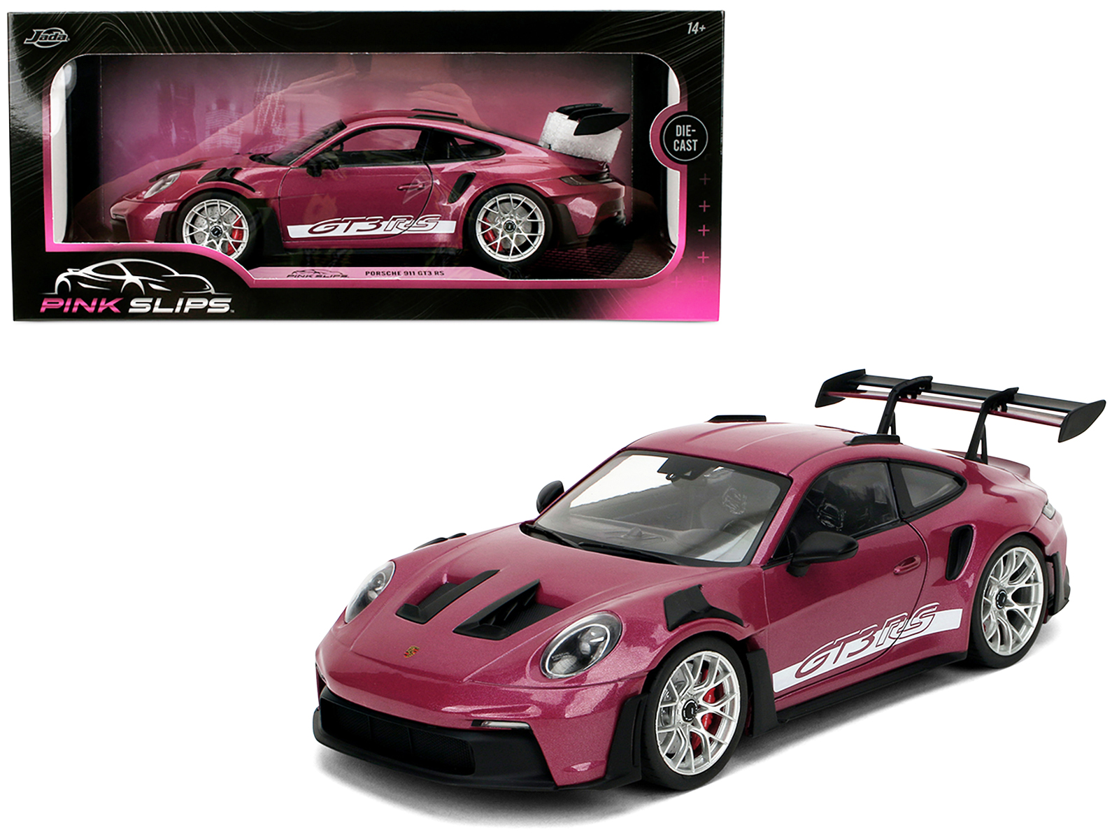 - Brand new 1/18 scale diecast car model of Porsche 911 GT3 RS Red Violet Metallic with White Stripes “Pink Slips” Series die cast model car by Jada.