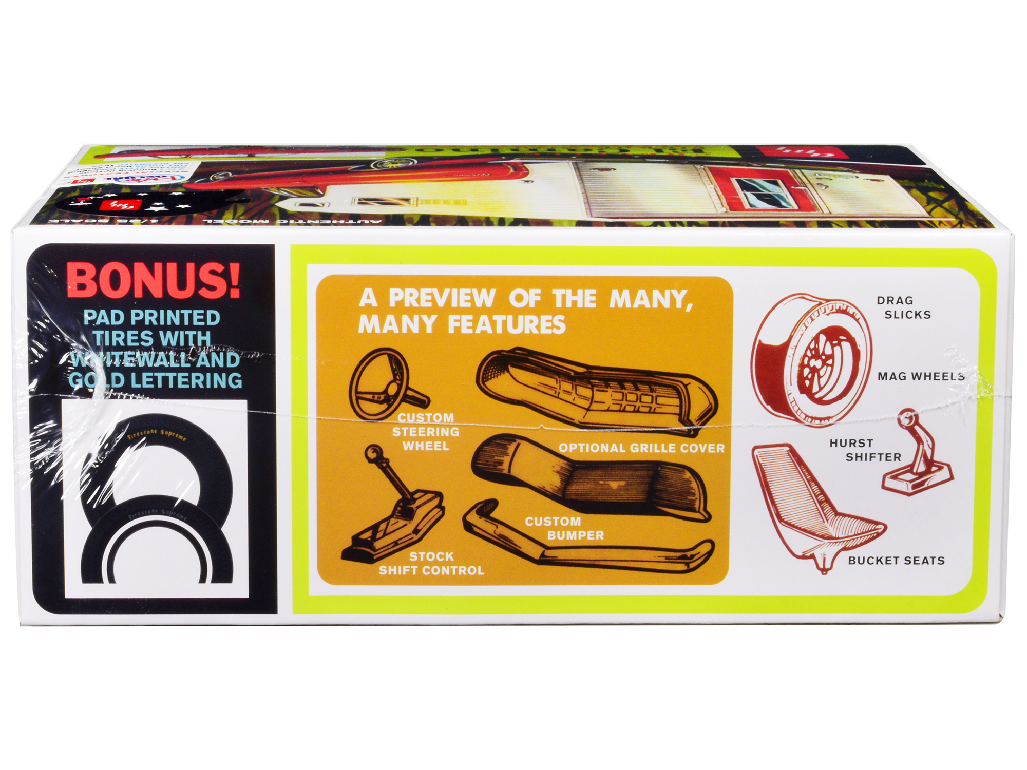 - Pad printed tires with whitewall and gold lettering.
