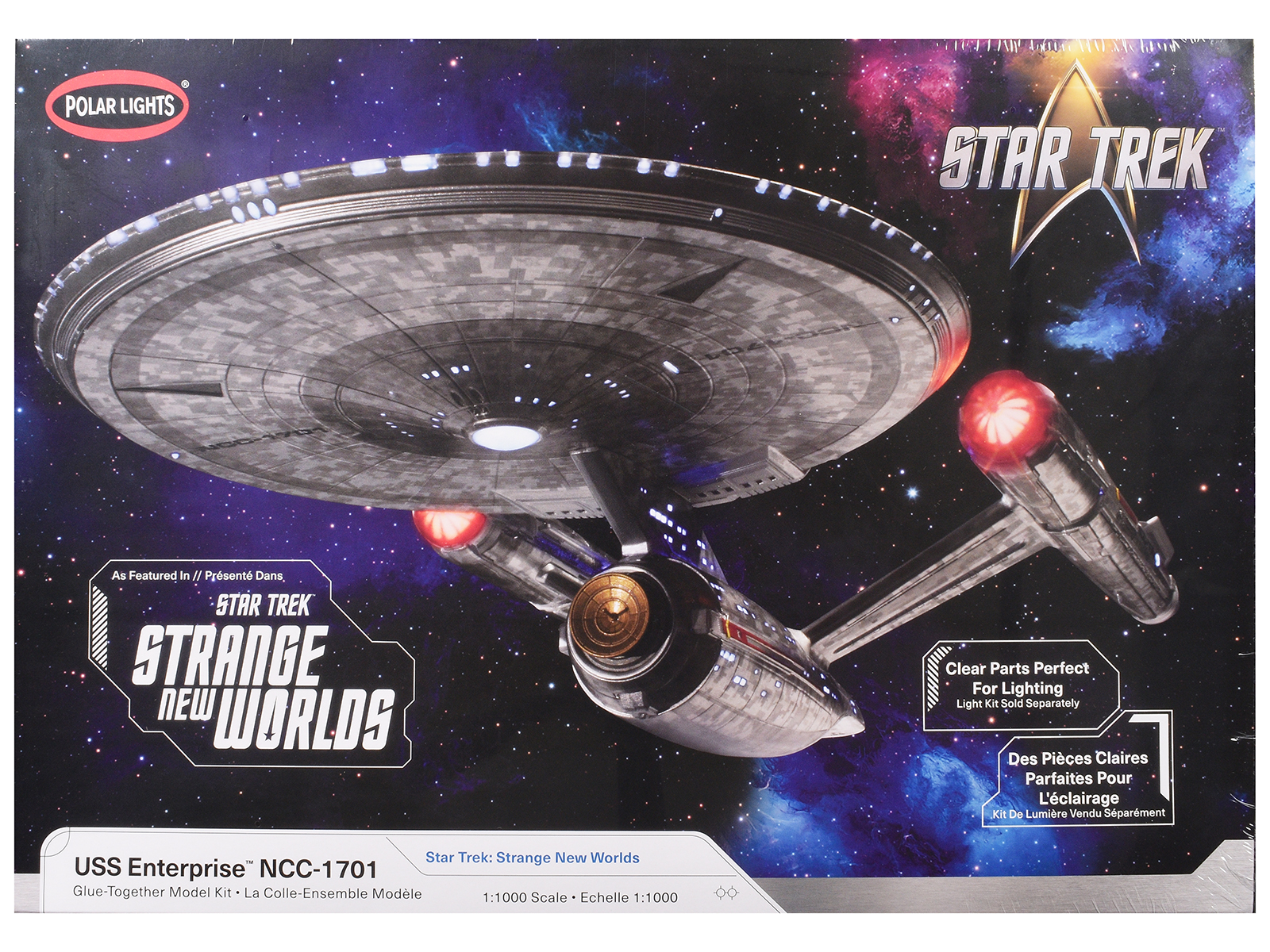 - Brand new scale plastic model kit of USS Enterprise NCC-1701 Spacecraft “Star Trek: Strange New Worlds” (2022-Current) TV Series (Skill 2) 1/1000 plastic model kit by Polar Lights.