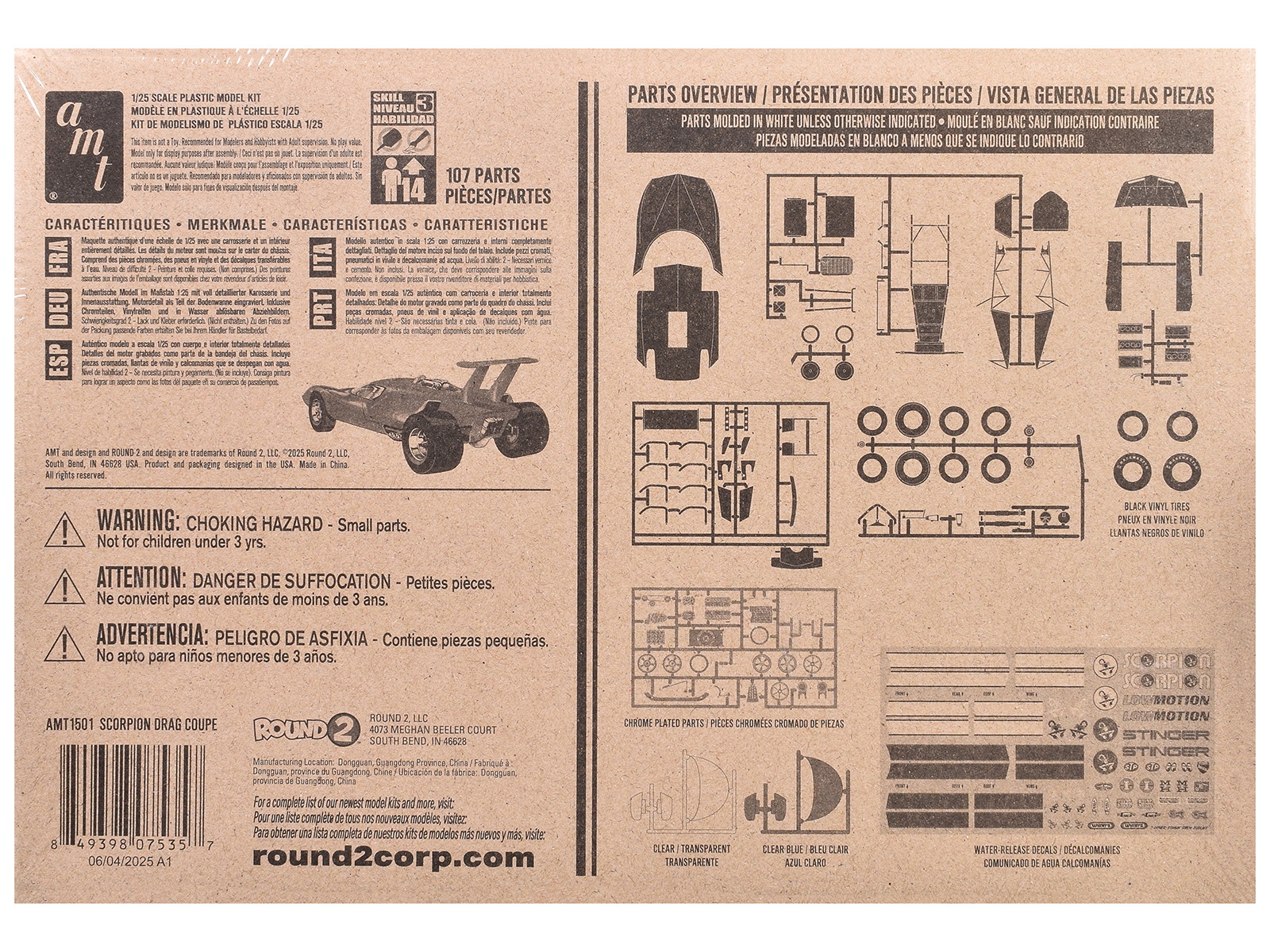 - Brand new plastic model kit of Scorpion Mid-Engine Drag Coupe (Skill 3) 1/25 plastic model kit by AMT.