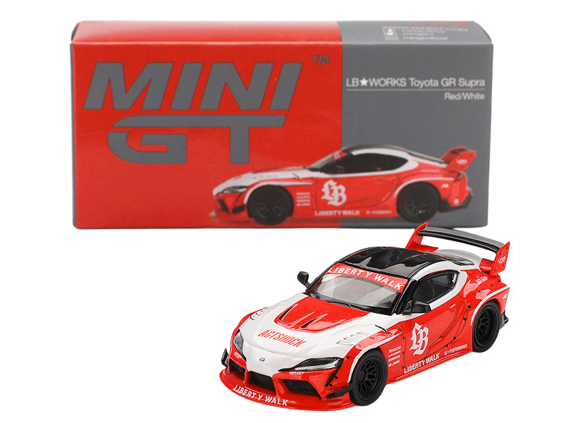 - Brand new 1/64 scale diecast car model of Toyota GR Supra “LB-Works” Red with White Stripes and Black Top Limited Edition die cast model car by Mini GT.