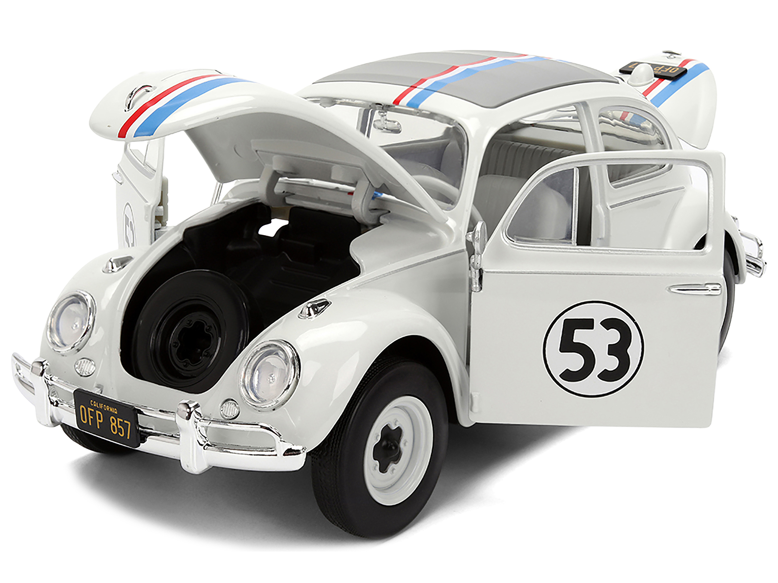 - Brand new 1/24 scale diecast car model of Volkswagen Beetle #53 “Herbie” White with Stripes “The Love Bug” (1968) Movie with Extra Wheels die cast model car by Jada.